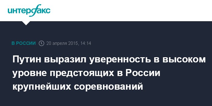 Москва. 20 апреля. INTERFAX.RU - Президент РФ Владимир Путин выразил уверенность в том, что Россия проведет на высшем уровне все намеченные в ближайшие годы на ее территории международные соревнования.