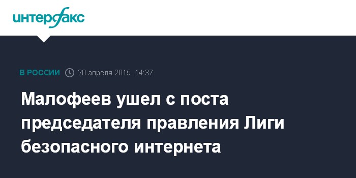 Москва. 20 апреля. INTERFAX.RU - Бизнесмен Константин Малофеев покинул пост председателя правления Лиги безопасного интернета (ЛБИ), говорится в сообщении организации.