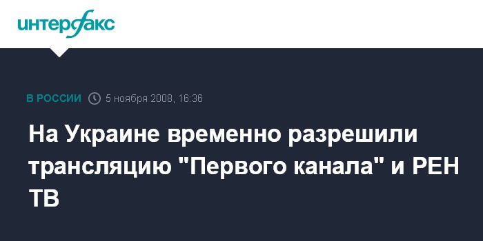 Москва. 5 ноября. INTERFAX.RU - Национальный совет по вопросам телевидения и радиовещания Украины временно разрешил провайдерам программной услуги ретранслировать на территории страны российские телеканалы "Первый канал. Всемирная сеть" и РЕН ТВ.