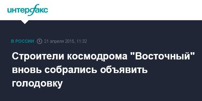 Москва. 21 апреля. INTERFAX.RU - 22 работника стройки на космодроме "Восточный" в Амурской области, которым по-прежнему не вернули долги по зарплате, собираются устроить в среду голодовку, заявил один из участников планируемой акции.
