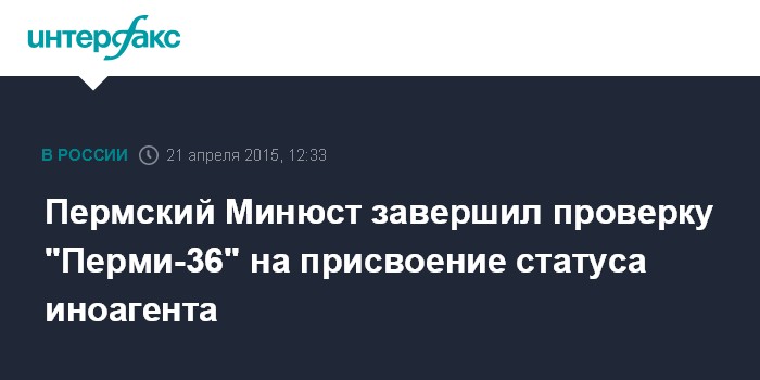 Москва. 21 апреля. INTERFAX.RU - Министерство юстиции Пермского края завершило проверку автономной некоммерческой организации "Пермь-36" на предмет присвоения статуса иностранного агента, сообщили агентству "Интерфакс" в министерстве.