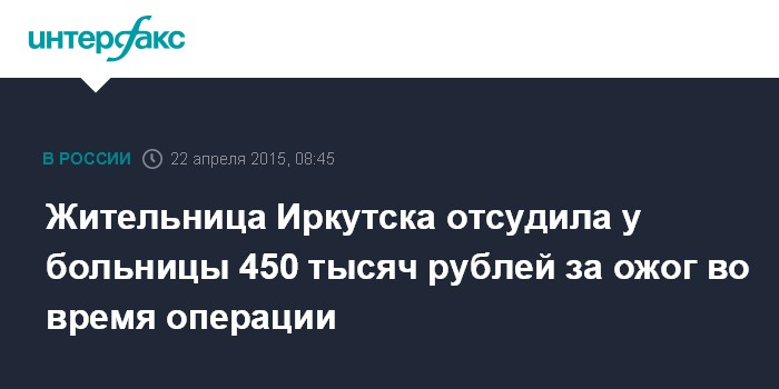 Москва. 22 апреля. INTERFAX.RU - Суд в Иркутске обязал городскую больницу выплатить пациенте 450 тыс. рублей в качестве компенсации морального вреда за ожог, полученный во время операции.
