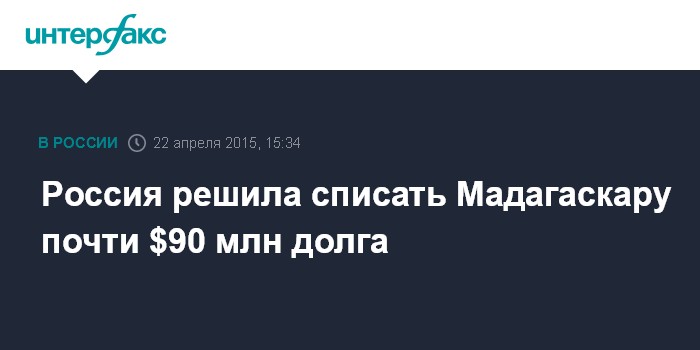 Москва. 22 апреля. INTERFAX.RU - Россия намерена простить Мадагаскару долг в размере более $88 млн, направив эти средства на финансирование проектов в области развития на территории республики.