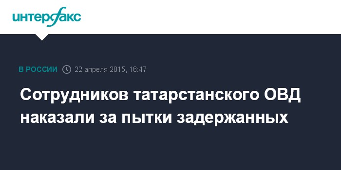 Москва. 22 апреля. INTERFAX.RU - Глава МВД Татарстана Артем Хохорин подписал приказ о привлечении к дисциплинарной ответственности руководства и сотрудников отдела полиции по Актанышскому району республики, где пытали задержанного, сообщает пресс-служба Казанского правозащитного центра (КПЦ) в среду.