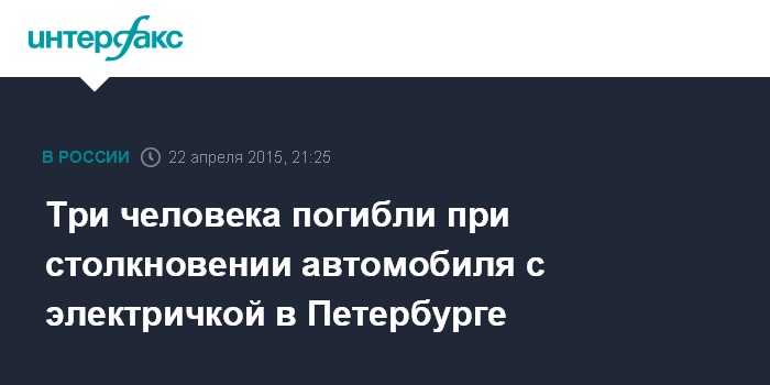 Москва. 22 апреля. INTERFAX.RU - Три человека погибли в результате столкновения электропоезда с легковым автомобилем в Петродворцовом районе Санкт-Петербурга, сообщили "Интерфаксу" в пресс-службе регионального управления ГИБДД в среду.