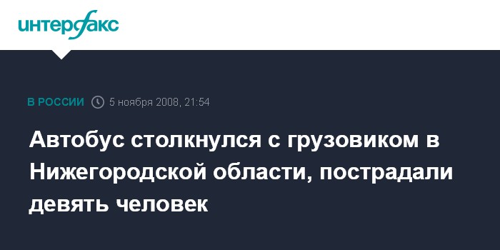 Москва. 5 ноября. NTERFAX.RU - Девять человек пострадали в ДТП с участием рейсового автобуса в Нижегородской области в среду, сообщил "Интерфаксу" начальник пресс-службы Главного управления МЧС РФ по Нижегородской области Олег Зугеев.