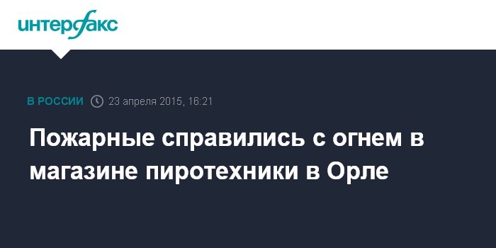 Москва. 23 апреля. INTERFAX.RU - Пожарные ликвидировали возгорание в магазине пиротехники в Орле, сообщили "Интерфаксу" в центральном региональном центре МЧС РФ.