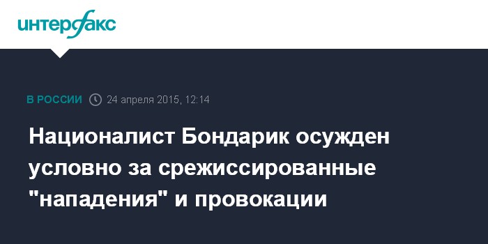 Москва. 24 апреля. INTERFAX.RU - Лидер общественного движения "Русская партия", националист Николай Бондарик осужден за разжигание ненависти и вражды после размещения провокационных материалов в интернете. Об этом сообщил корреспондент "Интерфакса" из зала Калининского суда Петербурга.