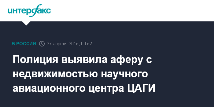 Москва. 27 апреля. INTERFAX.RU - Сотрудники МВД и прокуратуры выявили факт незаконного отчуждения имущественных активов Центрального аэрогидродинамического института (ЦАГИ) и задержали трех подозреваемых в этой афере, сообщили "Интерфаксу" в пресс-центре МВД России.