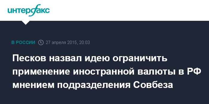Москва. 27 апреля. INTERFAX.RU - Предложения комиссии Совбеза РФ об ограничении применения иностранной валюты в РФ являются мнением одного из подразделений Совета Безопасности, заявил пресс-секретарь президента Дмитрий Песков.