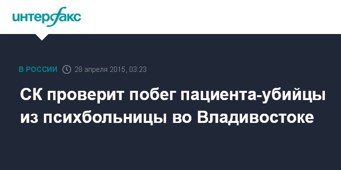 Москва. 28 апреля. INTERFAX.RU - Следователи начали проверку по факту побега пациента из психиатрической больницы во Владивостоке, куда его поместили по решению суда в связи с делом об убийстве. Об этом "Интерфаксу" сообщила старший помощник руководителя СУ СКР по Приморью Аврора Римская.