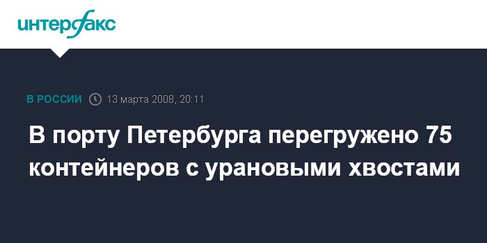 Санкт-Петербург. 13 марта. ИHТЕРФАКС СЕВЕРО-ЗАПАД - В порту Петербурга завершилась разгрузка прибывшего накануне очередного судна из Германии с обедненным ураном, который ввозится из Европы для последующей переработки.