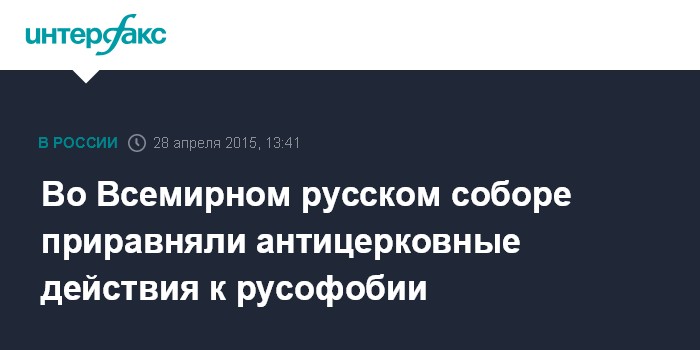 Москва. 28 апреля. INTERFAX.RU - Оскорбление православных святынь и членов Русской православной церкви должно быть приравнено к русофобии, заявили во Всемирном русском народом соборе, главой которого является патриарх Московский и всея Руси Кирилл.