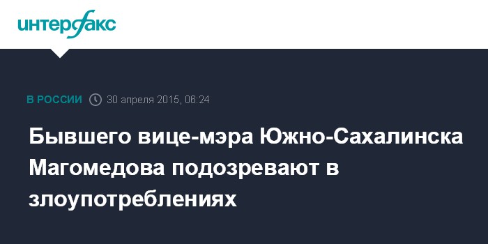 Москва. 30 апреля. INTERFAX.RU - Уголовное дело о злоупотреблениях возбуждено в отношении бывшего вице-мэра Южно-Сахалинска Магомеда Магомедова, сообщила в четверг прокуратура Сахалинской области.