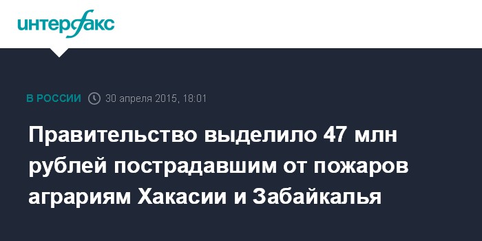 Москва. 30 апреля. INTERFAX.RU - Правительство РФ выделило 47,5 млн рублей сельхозпроизводителям Хакасии и Забайкальского края на компенсацию ущерба, причиненного природными пожарами. Соответствующее распоряжение размещено на сайте правительства. Документ подготовлен Минсельхозом.