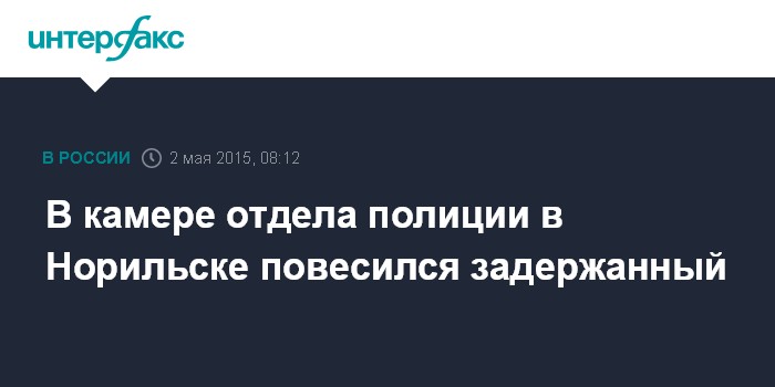 Москва. 2 мая. INTERFAX. Мужчина, задержанный за угрозу убийством и причинение вреда здоровью своей сожительницы, повесился в камере отдела полиции в городе Норильске (Красноярский край). Об этом сообщает пресс-служба ГУ МВД по региону.