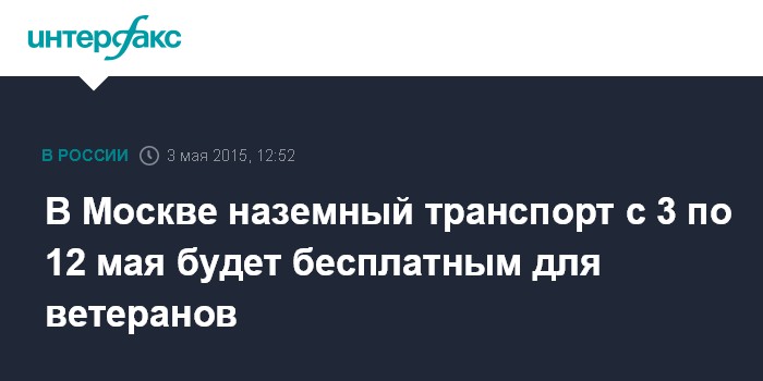 Москва. 3 мая. INTERFAX.RU - Столичный наземный транспорт в дни празднования 70-й годовщины Победы будет бесплатным для всех ветеранов, сообщили "Интерфаксу" в пресс-службе ГУП "Мосгортранс".