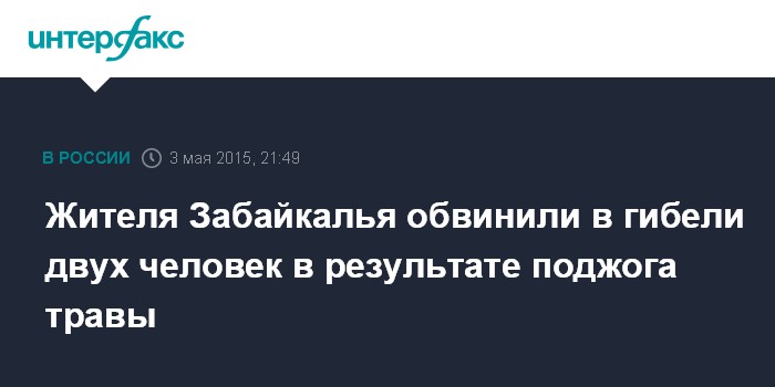 Москва. 3 мая. INTERFAX.RU - В Забайкальском крае 54-летний житель Ононского района Цыден Надцалов предстанет перед судом за поджог сухой травы, в результате которого погибли два человека. Об этом сообщает прокуратура региона.