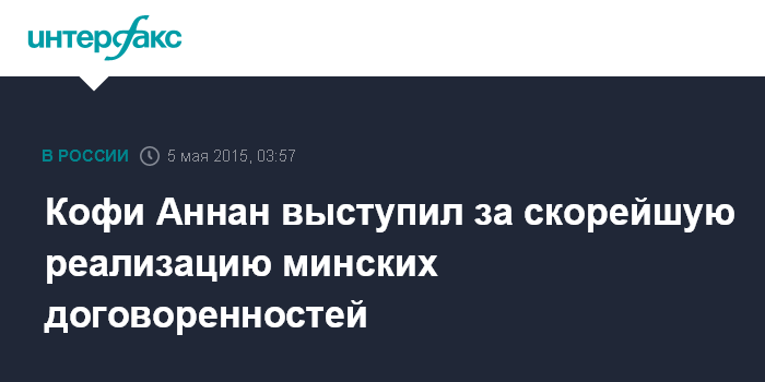 Москва. 5 мая. INTERFAX.RU - Добиться реализации минских договоренностей необходимо как можно скорее, убежден бывший генеральный секретарь ООН Кофи Аннан, посетивший Россию в составе "Группы старейшин".