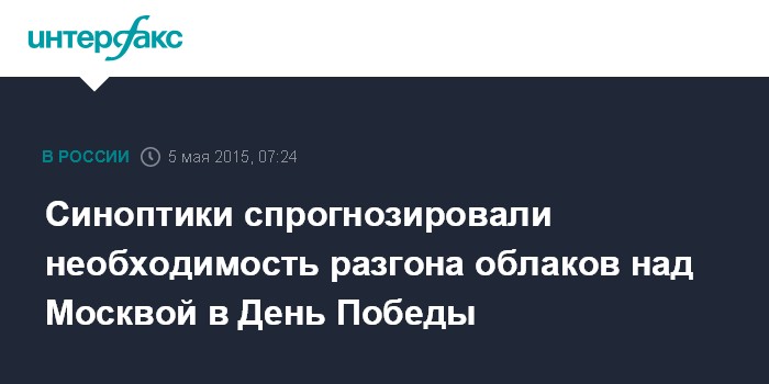 Москва. 5 мая. INTERFAX.RU - В день 70-летия Победы в Великой Отечественной войне, вполне вероятно, потребуются средства метеозащиты, сообщили "Интерфаксу" в Гидрометеобюро Москвы и Московской области в во вторник.