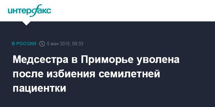 Москва. 5 мая. INTERFAX.RU - Медсестра, ставшая фигуранткой уголовного дела за то, что избила семилетнюю девочку, чтобы сделать ей укол, уволена из больницы в Приморье, сообщили агентству "Интерфакс" в департаменте здравоохранения администрации региона.