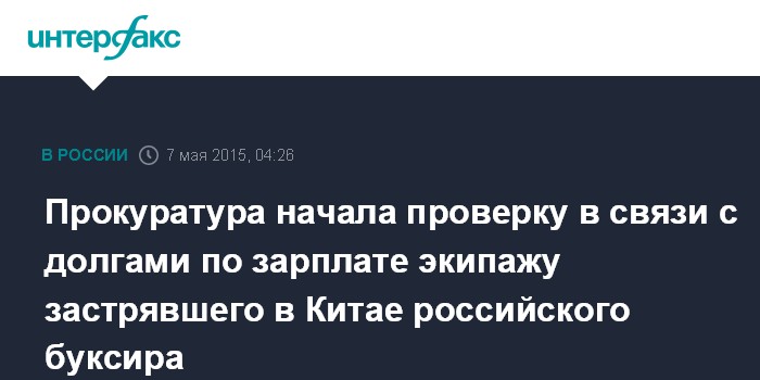 Прокуратура начала проверку в связи с долгами по зарплате экипажу застрявшего в Китае российского буксира