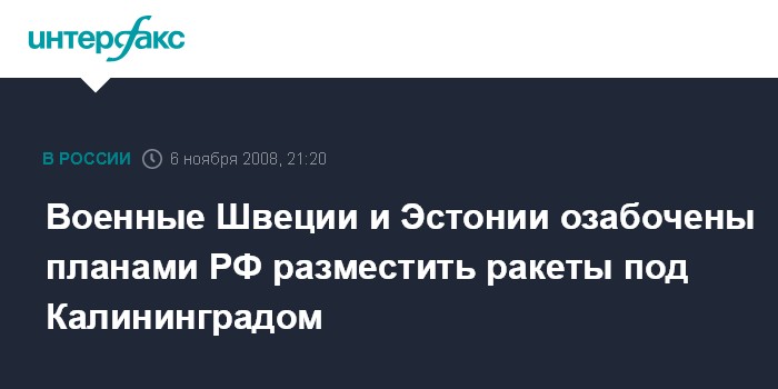 Москва. 6 ноября. INTERFAX.RU - Командующие вооруженными силами Швеции и Эстонии выразили озабоченность намерением России разместить в Калининградской области ракетный комплекс.