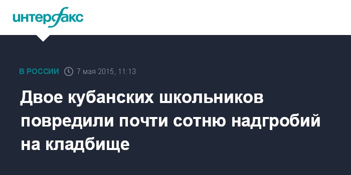 Москва. 7 мая. INTERFAX.RU - Двое школьников устроили погром на кладбище станицы Ладожской в Краснодарском крае, сообщили в четверг агентству "Интерфакс" в пресс-службе ГУ МВД по краю.