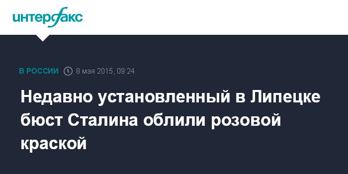 Москва. 8 мая. INTERFAX.RU - В ночь на пятницу в Липецке облили розовой краской бюст Иосифа Сталина, который накануне 70-летия Победы установили местные коммунисты рядом с расположенным в центре города офисом обкома КПРФ, сообщил корреспондент "Интерфакса".