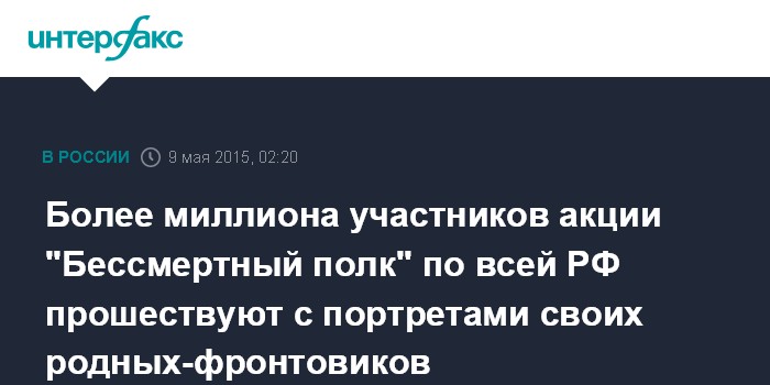 Москва. 9 мая. INTERFAX.RU - Более одного миллиона человек примут участие в акции "Бессмертный полк", которая пройдет во всех субъектах РФ в День 70-летия Победы в Великой Отечественной войне; в Москве по Красной площади пройдут около 200 тысяч участников акции, в том числе из зарубежных государств, сообщают организаторы мероприятия.