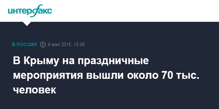Москва. 9 мая. INTERFAX.RU - Около 70 тыс. человек приняли участие в праздничных мероприятиях и в параде в Крыму, сообщили "Интерфаксу" в субботу в пресс-службе МВД республики.