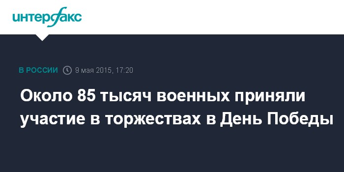 Москва. 9 мая. INTERFAX.RU - Военные парады и торжественные шествия прошли в честь 70-й годовщины Победы в Великой Отечественной войне по всей стране - от Владивостока до Калининграда и от Североморска до Севастополя, сообщает в субботу управление пресс-службы и информации Министерства обороны России.