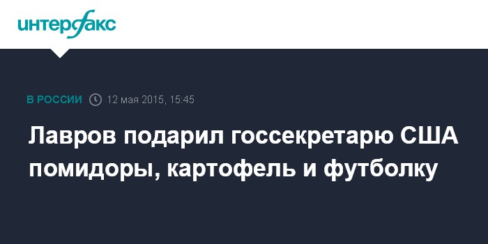 Москва. 12 мая. INTERFAX.RU - Глава МИД России Сергей Лавров в ходе переговоров с госсекретарем США Джоном Керри в Сочи преподнес своему американскому коллеге несколько подарков, в частности, краснодарские помидоры и картошку, сообщила заместитель директора департамента информации и печати МИД РФ Мария Захарова.