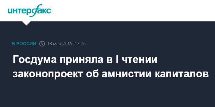 Москва. 13 мая. INTERFAX.RU - Госдума на заседании в среду приняла в первом чтении правительственный законопроект об амнистии капиталов.