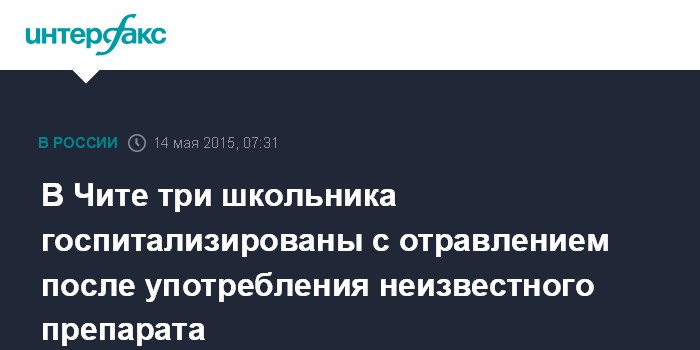 Москва. 14 мая. INTERFAX.RU - В Чите три школьника госпитализированы с отравлением после употребления неизвестного препарата, один из них - в тяжелом состоянии, сообщает в четверг пресс-служба краевого УМВД.