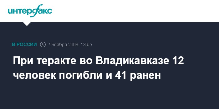 Москва. 7 ноября. INTERFAX.RU - В результате взрыва маршрутки во Владикавказе, по последним данным, семь человек погибли на месте, пять человек скончались в больнице, 41 человек ранен, сообщил журналистам в четверг в Петербурге глава Следственного комитета при прокуратуре РФ Александр Бастрыкин.