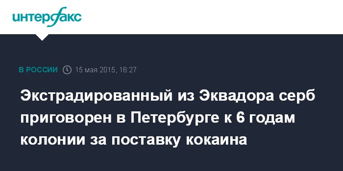 Москва. 15 мая. INTERFAX.RU - Гражданин Сербии осужден в Петербурге на 6 лет колонии строгого режима за контрабанду 4,5 кг кокаина из Эквадора в РФ.