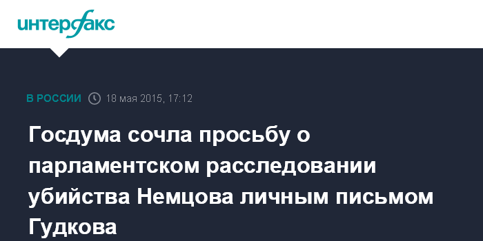 Москва. 18 мая. INTERFAX.RU - Обращение депутата Госдумы Дмитрия Гудкова с просьбой инициировать парламентское расследование убийства оппозиционного политика Бориса Немцова нельзя считать официальным запросом, это было просто письмо, заявили "Интерфаксу" в аппарате профильного думского комитета по конституционному законодательству и госстроительству.