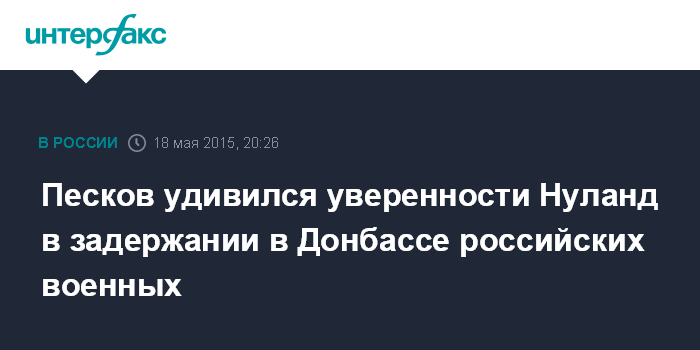 В понедельник в ходе общения пресс-секретаря президента РФ Дмитрия Пескова с журналистами была затронута тема якобы имевшего место в районе населенного пункта Счастье задержания украинской стороной двух российских военнослужащих. Прозвучали слова, что Нуланд "с уверенностью" заявила о том, что это именно российские военнослужащие.