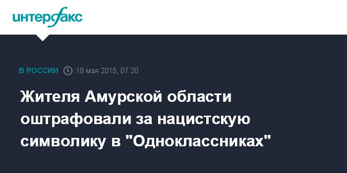 Москва. 19 мая. INTERFAX.RU - Пользователь интернета в Амурской области оштрафован решением Белогорского мирового судьи за публичную демонстрацию нацистской символики на своей странице в соцсети.