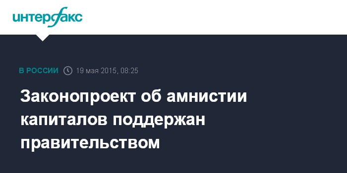 Москва. 19 мая. INTERFAX.RU - Правительство РФ поддержало законопроект об освобождении от ответственности за налоговые правонарушения в рамках легализации капиталов.