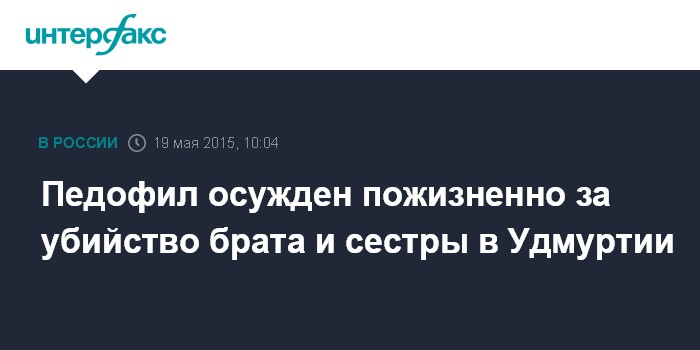 Москва. 19 мая. INTERFAX.RU - Верховный суд Удмуртии во вторник признал жителя Балезинского района республики Константина Русских виновным в убийстве малолетних брата и сестры в поселке Балезино и приговорил его к пожизненному заключению в колонии особого режима, сообщил корреспондент "Интерфакса".