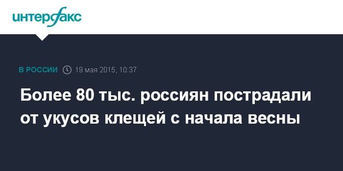 Москва. 19 мая. INTERFAX.RU - Этой весной в России к врачам обратились более 82 тыс. пострадавших от укусов клещей, в том числе, свыше 21 тыс. детей, сообщила руководитель Роспотребнадзора, главный государственный санитарный врач РФ Анна Попова.