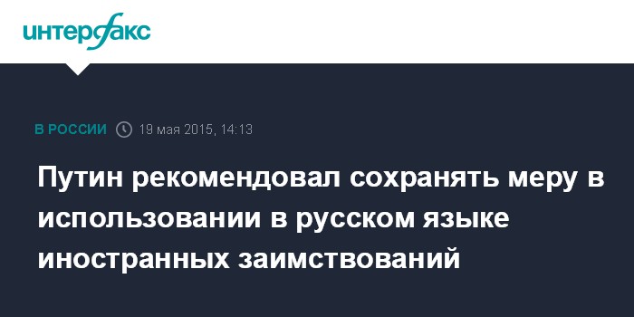 Москва. 19 мая. INTERFAX.RU - Президент РФ Владимир Путин призвал не допускать как самоизоляции, так и избыточности в иностранных языковых заимствованиях.