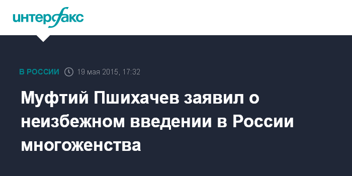 Москва. 19 мая. INTERFAX.RU - Многоженство в России - это реальность, которую рано или поздно придется признать, считает глава Международной исламской миссии, известный муфтий Шафиг Пшихачев.