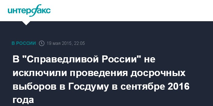 Москва. 19 мая. INTERFAX.RU - Руководство "Справедливой России" дало понять членам своей фракции в Госдуме, что не исключена возможность досрочного проведения парламентских выборов - не в декабре следующего года, а в сентябре, сообщил источник в партии.