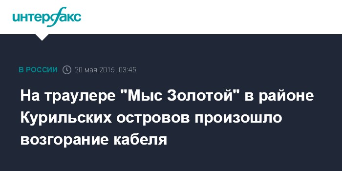 Москва. 20 мая. INTERFAX.RU - Сахалинский траулер-рефрижератор "Мыс Золотой" (Невельск) из-за возгорания кабельной трассы в машинном отделении потерял ход в районе Курильских островов и отбуксирован в порт Курильска, сообщили агентству "Интерфакс" в морском спасательном подцентре "Южно-Сахалинск".