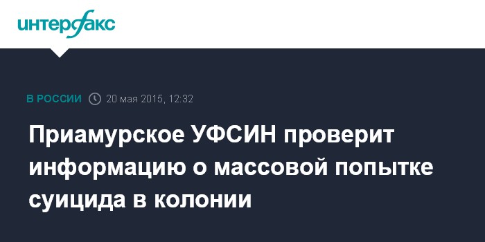 Москва. 20 мая. INTERFAX.RU - Руководство УФСИН по Амурской области выехало в Возжаевскую колонию для проверки информации о попытке массового суицида среди заключенных, сообщил "Интерфаксу" представитель ведомства Андрей Шевела.