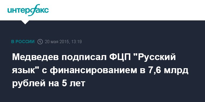 Москва. 20 мая. INTERFAX.RU - Глава российского правительства Дмитрий Медведев подписал федеральную целевую программу "Русский язык" на 2016-2020 годы с объемом финансирования 7,6 млрд рублей.