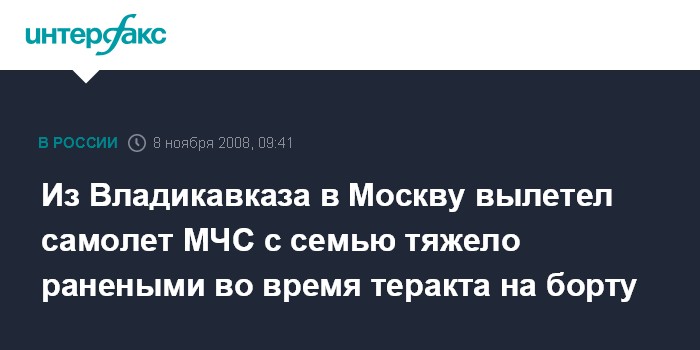 Владикавказ. 8 ноября. ИНТЕРФАКС-ЮГ - В 9:00 мск из аэропорта "Владикавказ" вылетел борт МЧС с семью пострадавшими во время взрыва на площади "Дружбы", сообщил "Интерфаксу" министр здравоохранения Северной Осетии Владимир Легкоев.